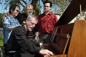Photo credit: Caroline True.Steve Schalchlin plays John Lennon's IMAGINE Piano surrounded by the Clayton family, Gabi, Alec and son, Noel, in honor of the late Bill Clayton. Taken in the front yard of Gabi & Alec Clayton, Olympia, Washington.